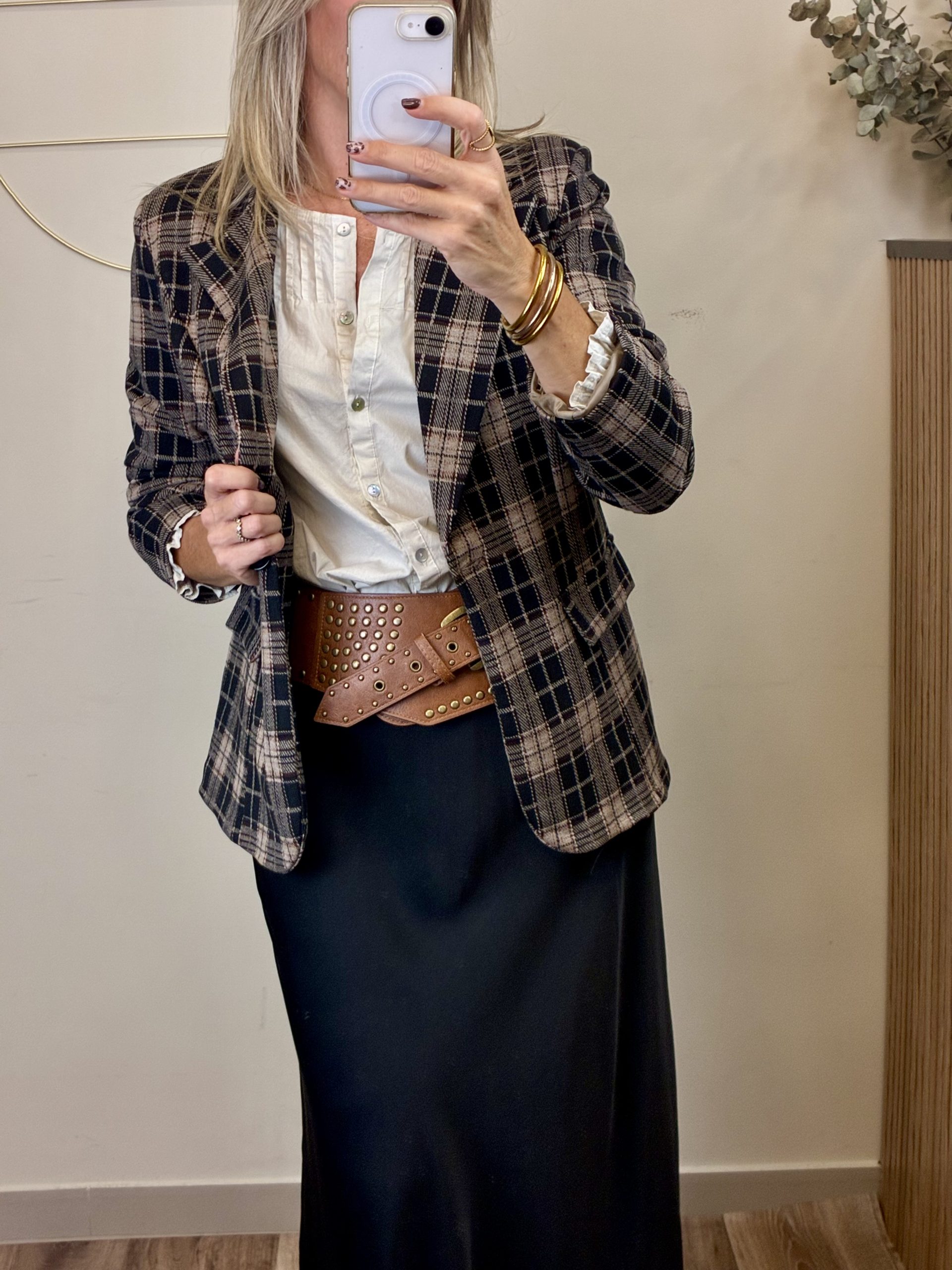 Americana de cuadros de corte amplio y con cierre de un botón. Bolsillos de taquillo. Manga larga. Lleva forro en el cuerpo y mangas. Cuello solapa. Gracias a su composición con un poco de elastano es super cómoda de llevar.