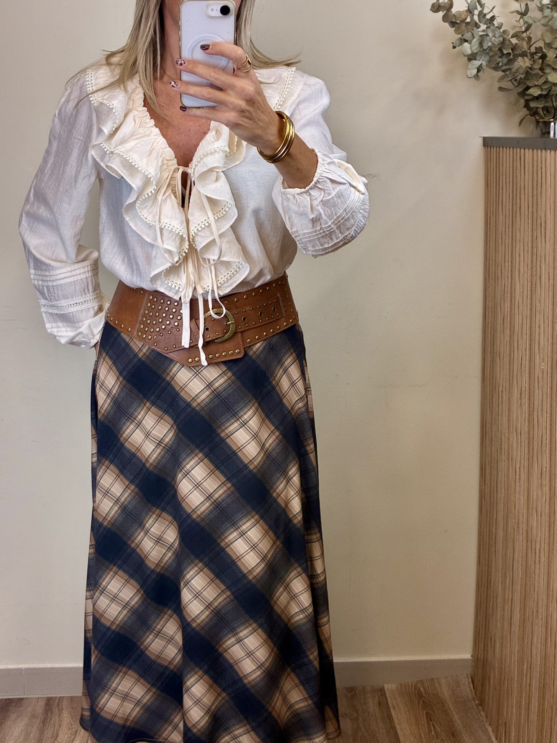 Blusa de cuello pico con doble volante con acabados en pintilla al mismo tono.Cierre con lazados dobles muy ajustables. Manga larga con detalle de puntilla al tono y gomo en el puño.