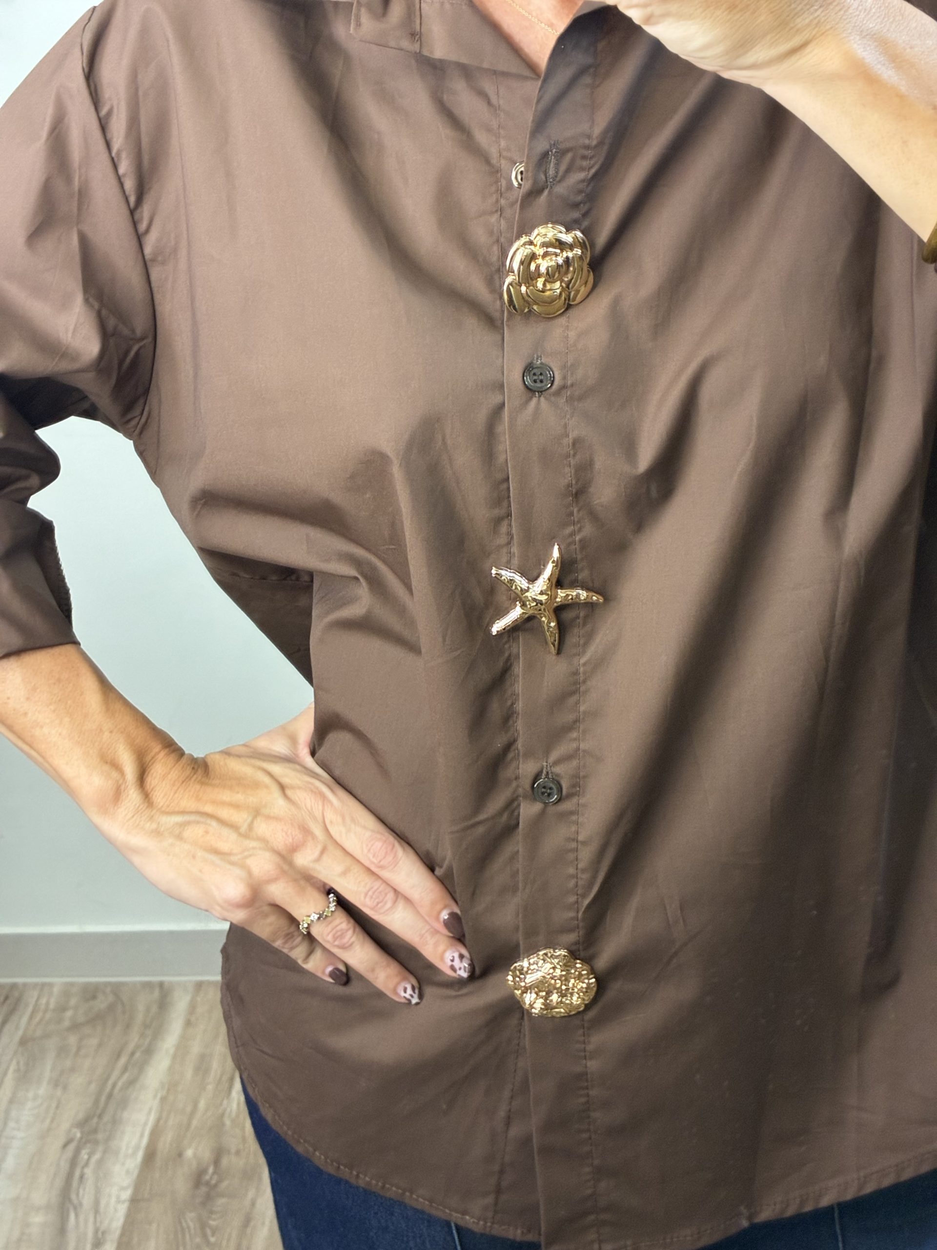 Blusa amplia de corte overside. Cuello camisero con botones y tres broches dorados en fantasia que se abrochan con imperdible para poder poner opcional. Manga larga con tira recogida con botón. La parte trasera un poco mas larga que la parte de delante. Blusa muy cómoda gracias a u tejido de algodón con un poco de elástano.