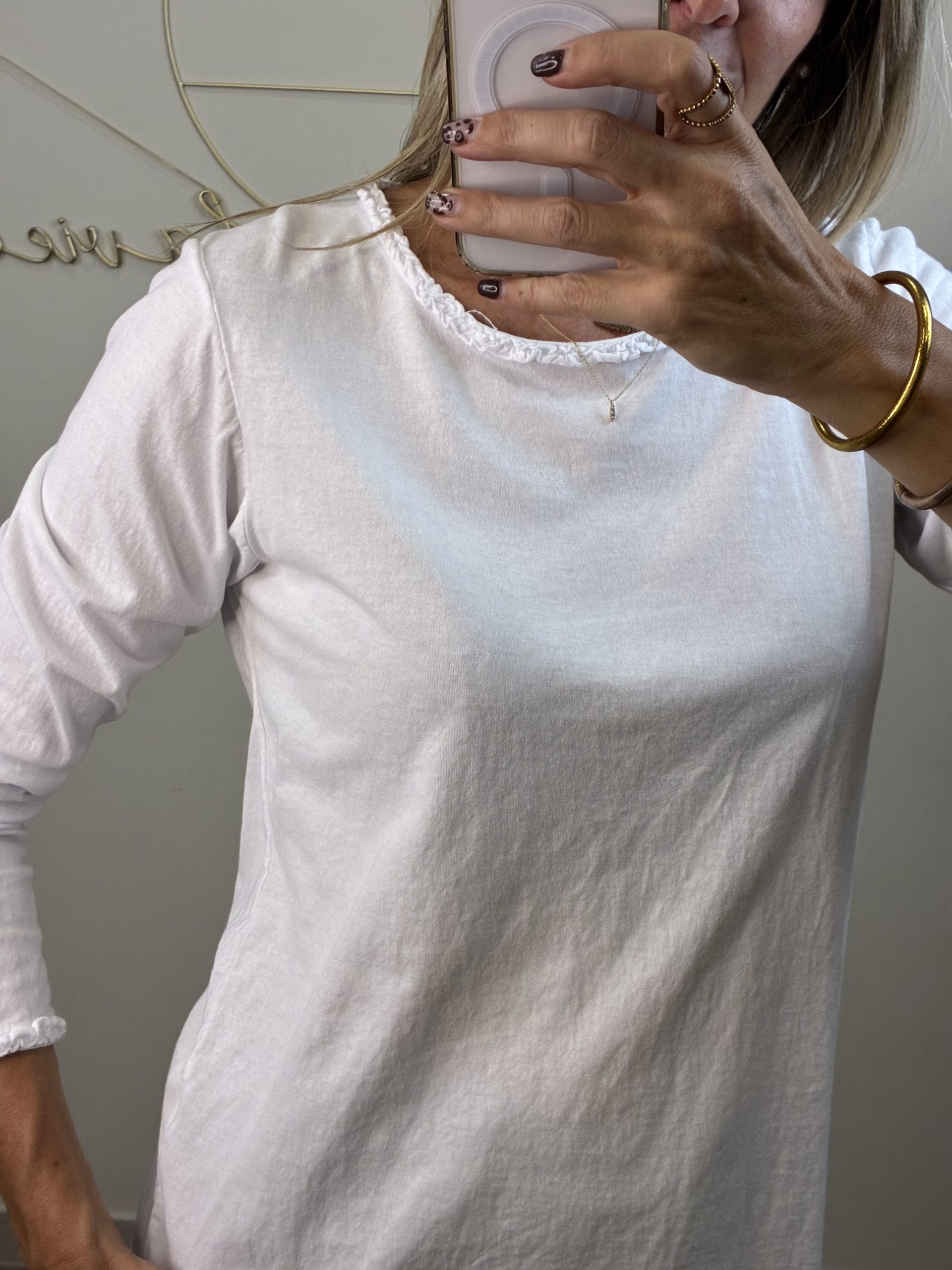 Camiseta básica con cuello redondo y detalle de plisaditos del mismo tejido. Manga larga con acabado en puño plisaditos igual que el escote.