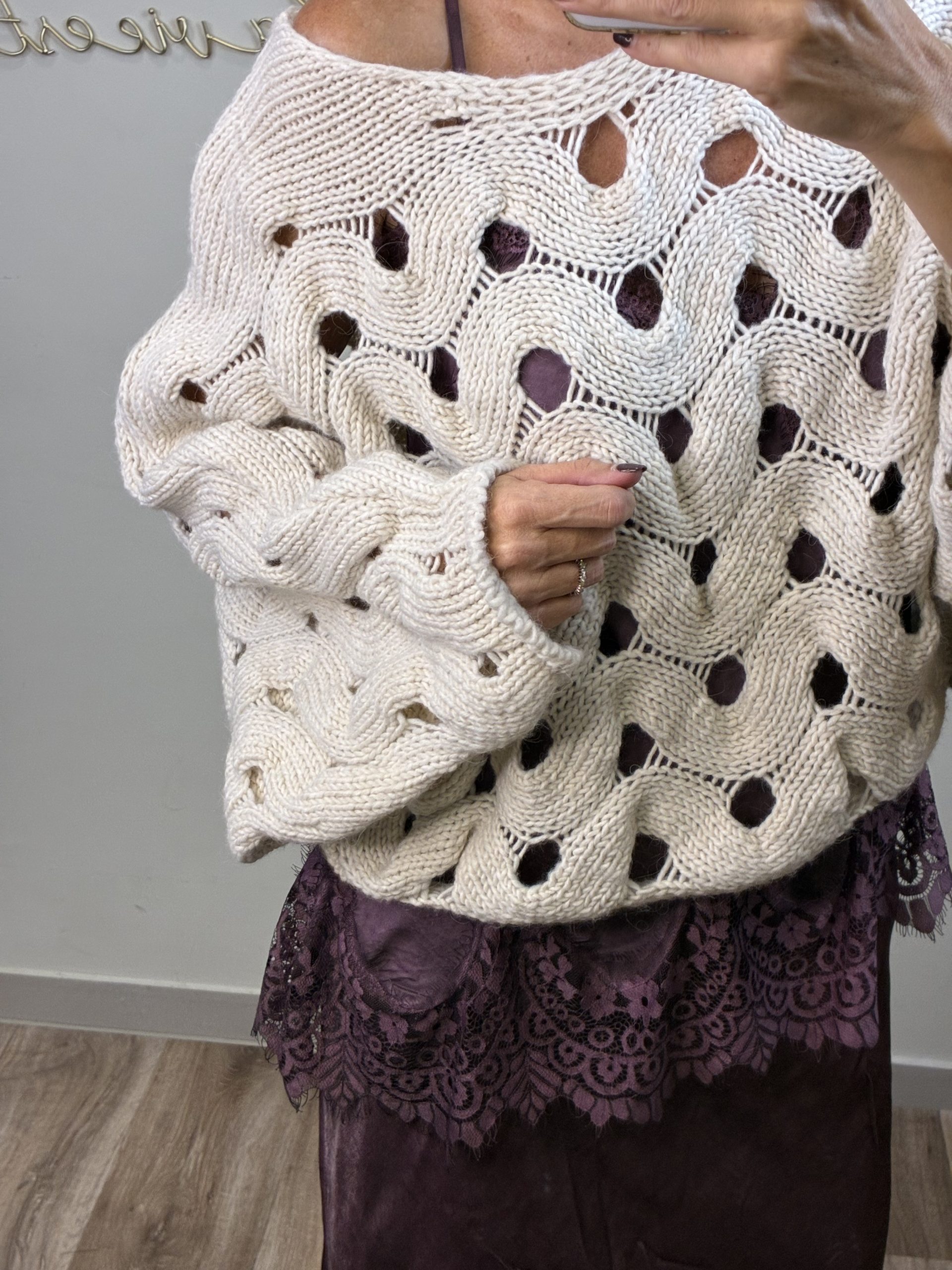 Jersey de punto tricotosa calado. Cuello barca. Manga larga muecielago. Amplio y cómodo graciass a su corte overside.