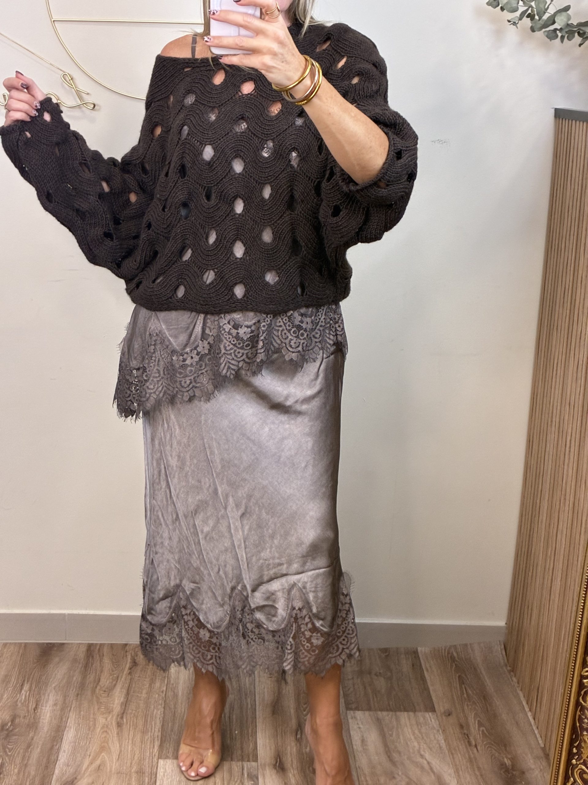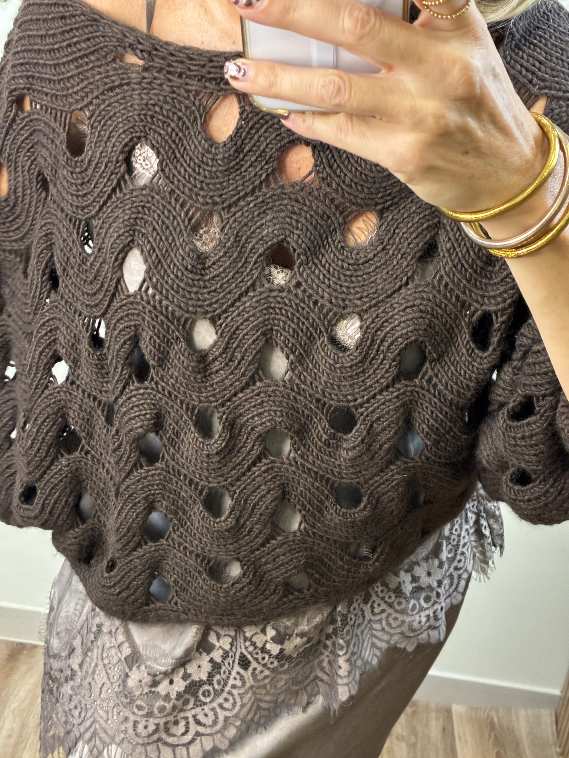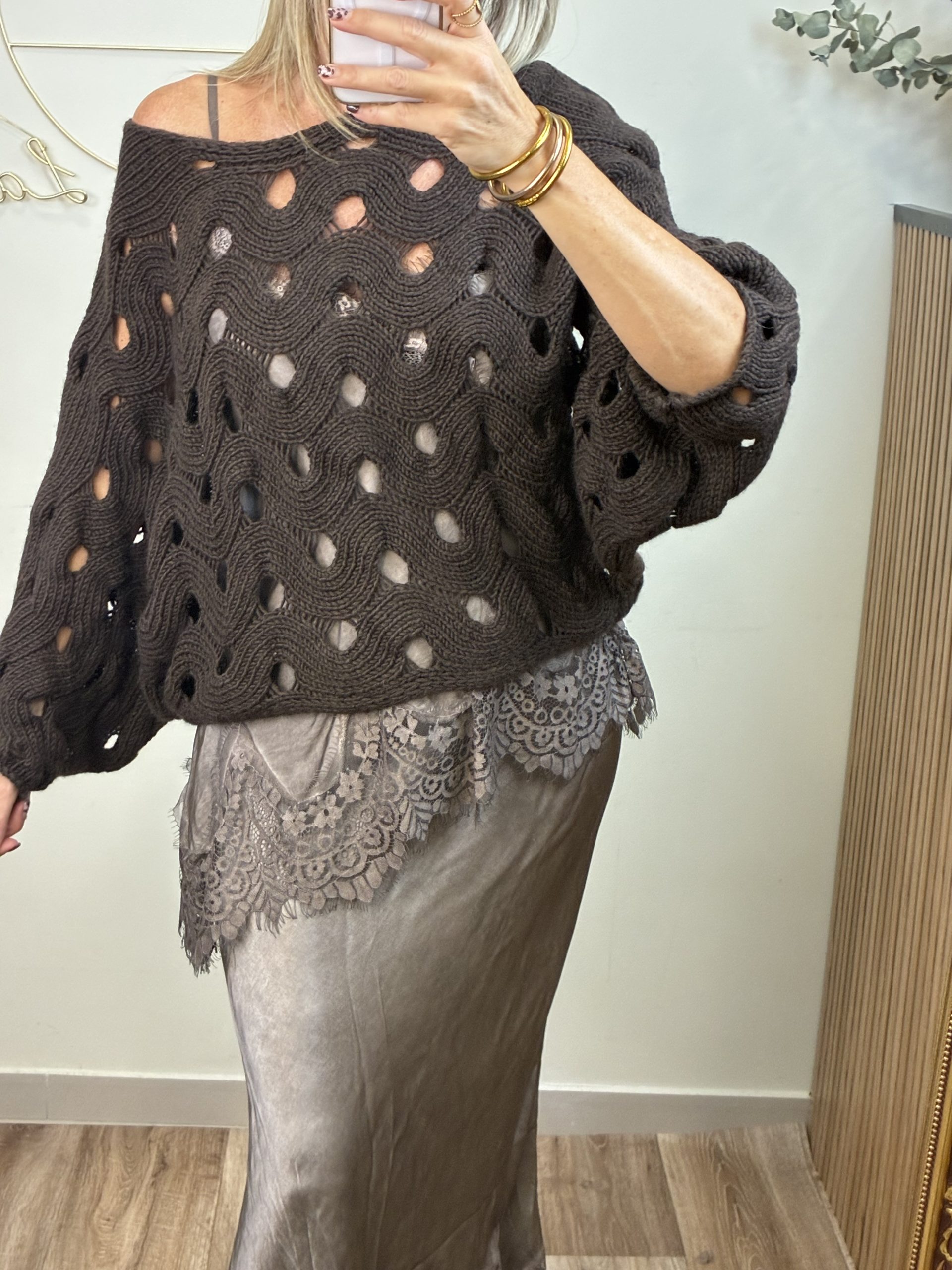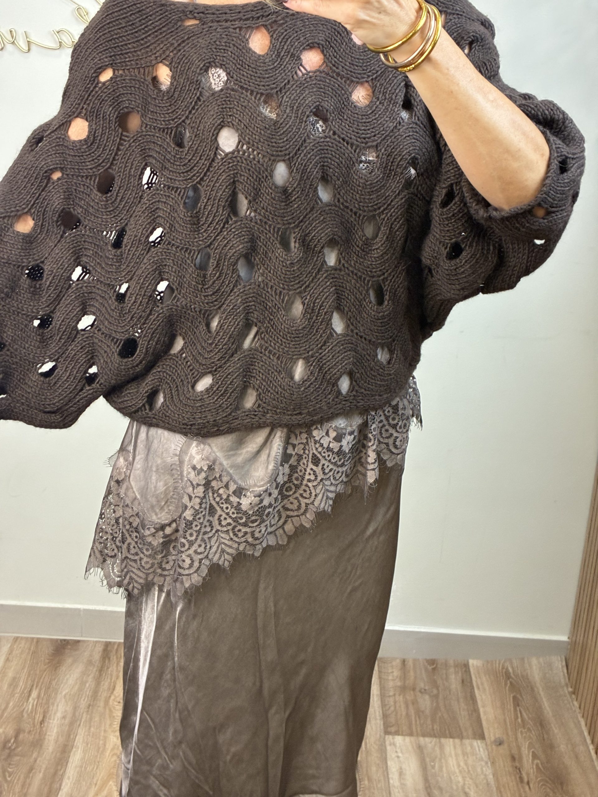 Jersey de punto tricotosa calado. Cuello barca. Manga larga muecielago. Amplio y cómodo graciass a su corte overside.